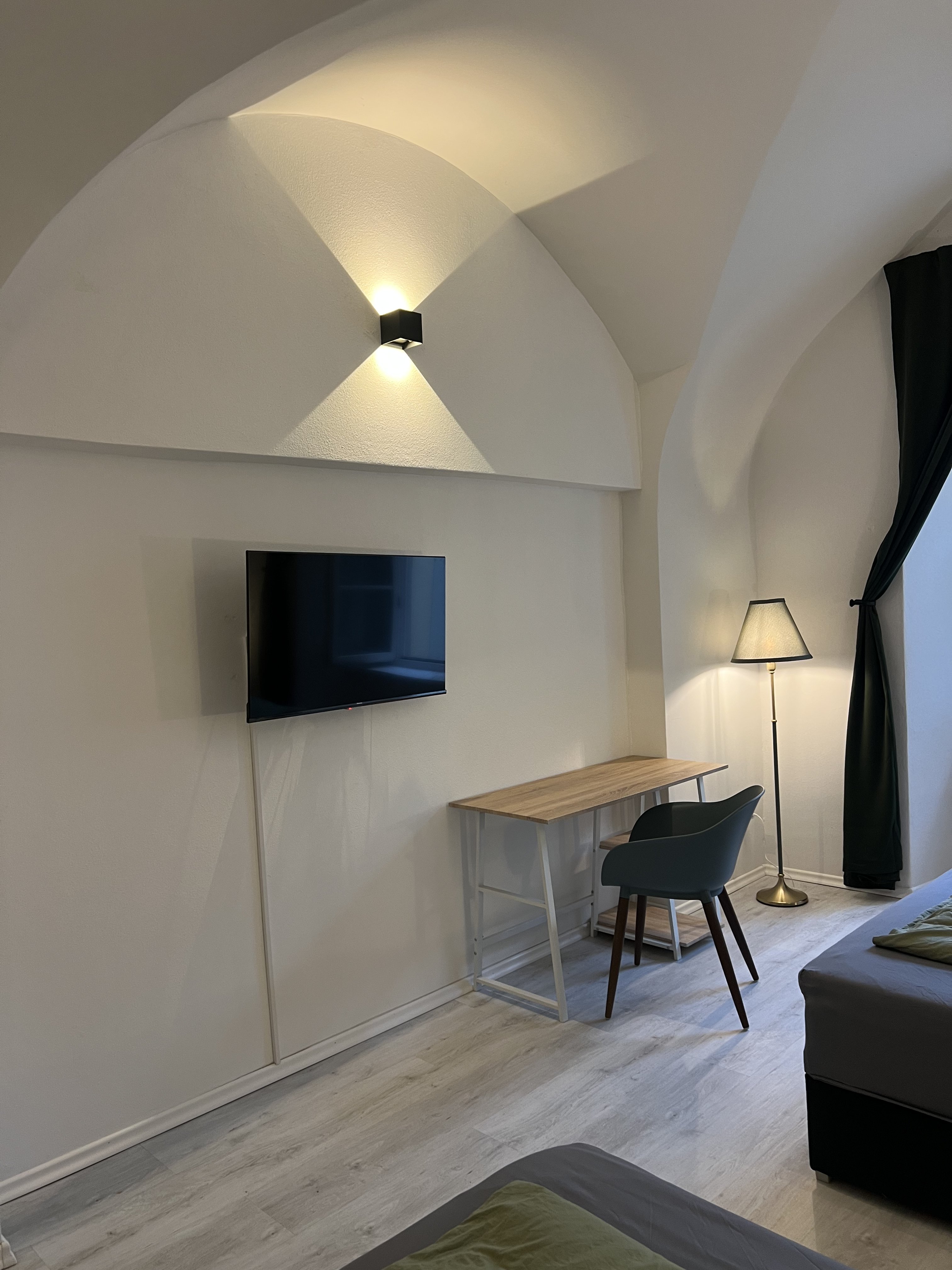 DreibettzimmerDas Zimmer bietet Platz für bis zu 4 Erwachsene und ist ideal für Ihren Aufenthalt. Ausgestattet mit einem komfortablen Kingsize-Bett und einem Schlafsofa, sorgt es für erholsame Nächte. Genießen Sie die atemberaubende Aussicht auf die Veste Oberhaus und die Donau!WiFi TV Schreibtisch Gemeinschaftsbad Stadtblick Flussblick Haartrockner Handtücher Schlafsofa Kingsize-Bett Kommode€ 47 pro Übernachtung